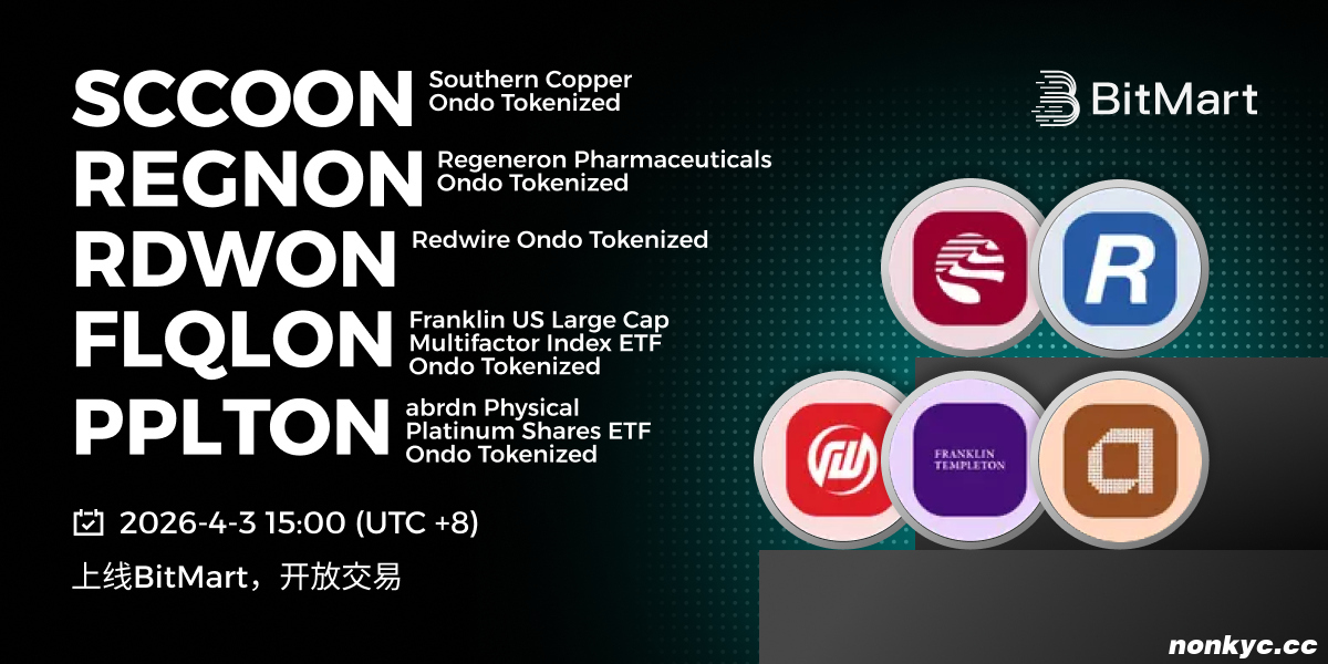 BitMart于2026年4月3日上线Stocks Southern Copper Ondo Tokenized(SCCOON)、Regeneron Pharmaceuticals Ondo Tokenized(REGNON)、Redwire Ondo Tokenized(RDWON)、Franklin US Large Cap Multifactor Index ETF Ondo Tokenized(FLQLON)、abrdn Physical Platinum Shares ETF Ondo Tokenized(PPLTON)。上线各项细节请参照: