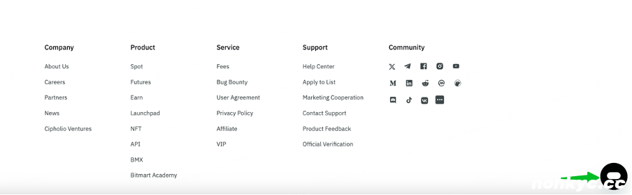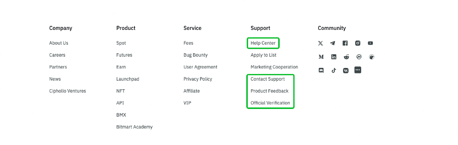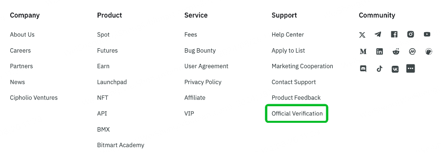 1.3 如何通过自助服务验证官方账户 访问 BitMart 网站并登录您的账户 滚动到首页底部,找到“支持”部分 选择 [官方验证]