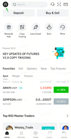 App版 打开 BitMart 应用程序并点击首页左上角的图标。