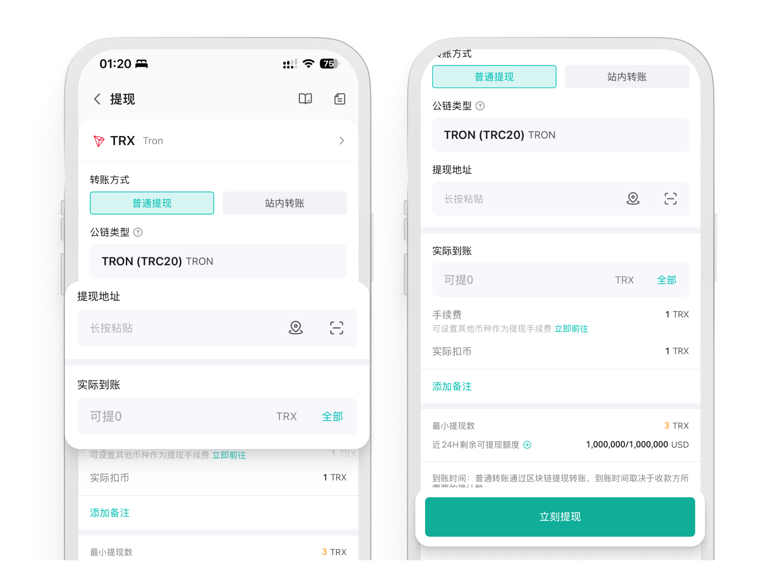 不同公链的最小提现数、手续费不同,转账到账时间依链上确认和网络状态而定。