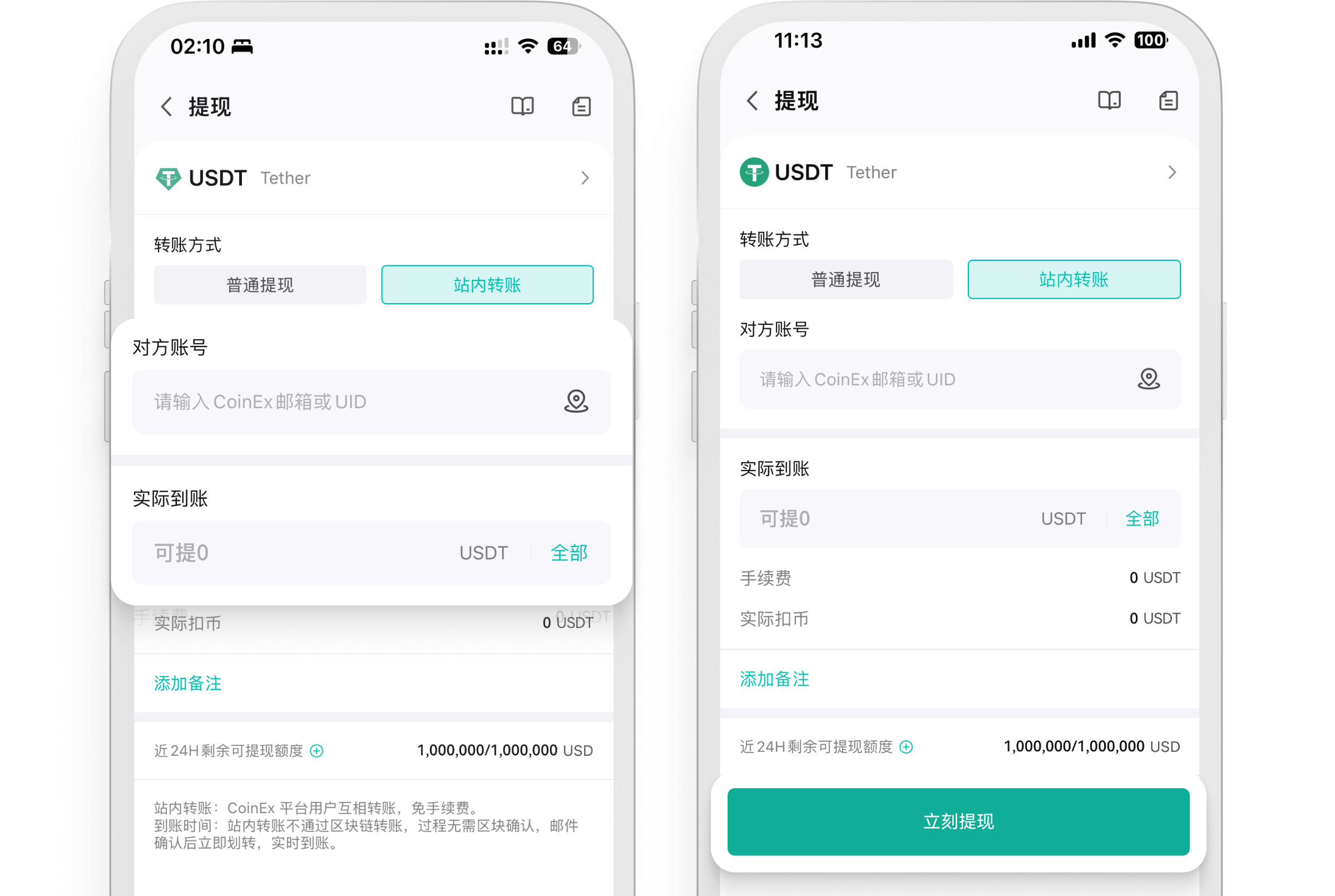 站内转账适用于 CoinEx 用户间的划转,无需链上确认和手续费,实时到账。