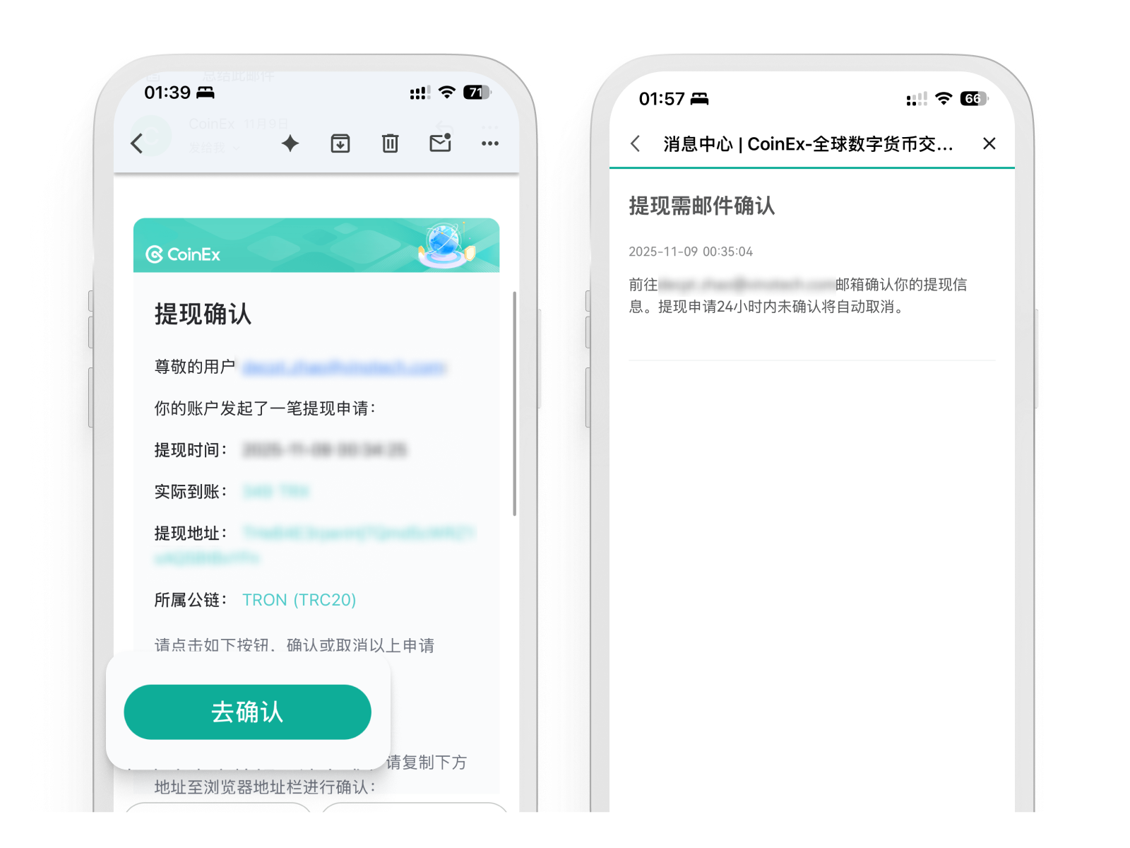 在接收平台选择对应币种和公链,获取充值地址,并在CoinEx提现页面收款地址与实际到账数量,确认信息无误后点击【提现】。