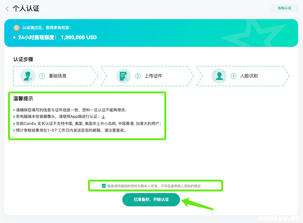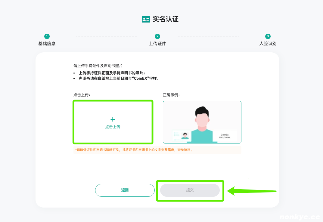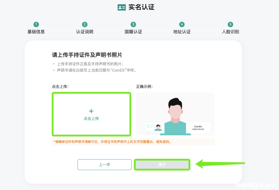 6、请确认手持声明书的内容包含:【CoinEx】与【当前日期】。
