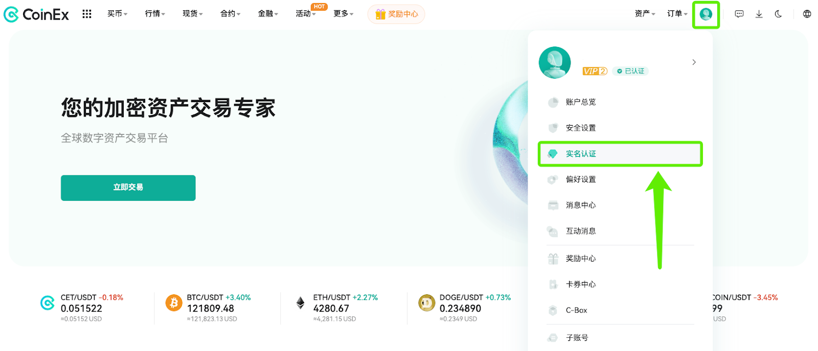 1、通过浏览器访问CoinEx官网(https://www.coinex.com),成功登录后,在右上角头像下拉菜单中,点击【实名认证】;