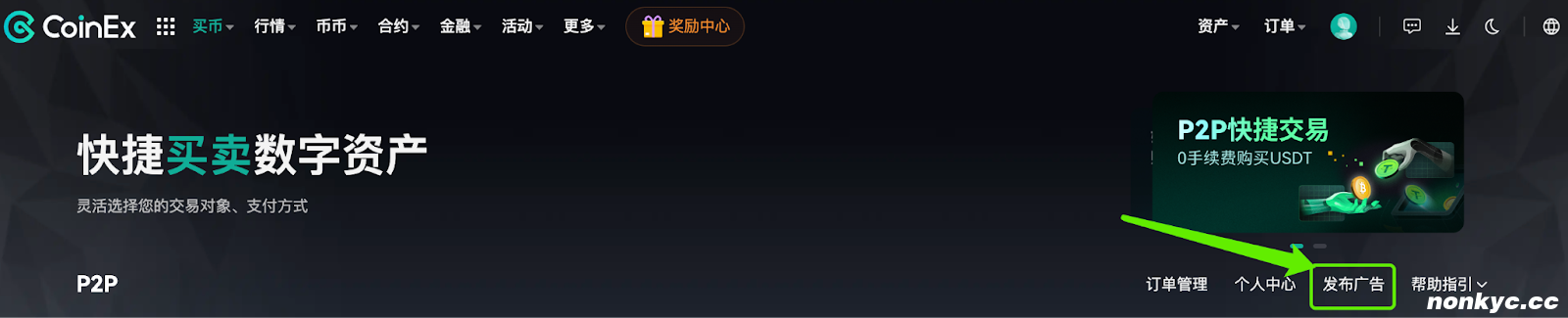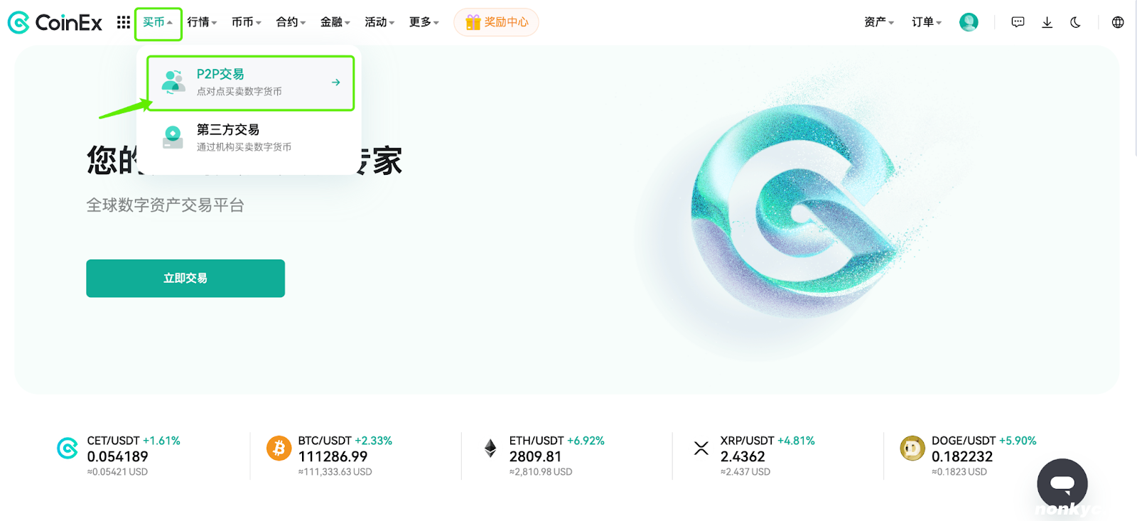 (1)通过浏览器访问CoinEx官网(https://www.coinex.com),成功登录后,在顶部导航栏【买币】下拉菜单中,点击【P2P交易】;