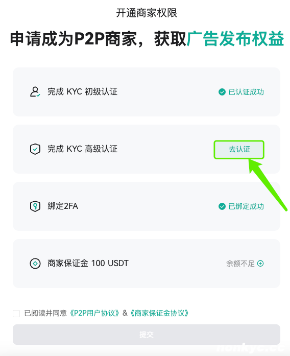 2、完成高级认证的用户有资格申请成为P2P交易的商家,获取广告发布权益。