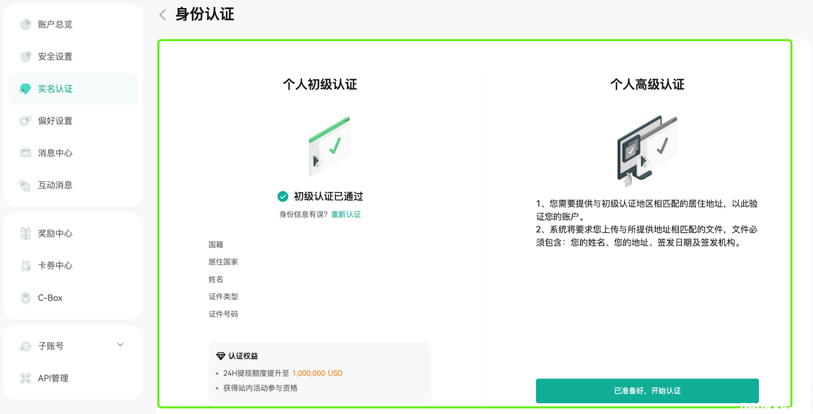 (1)再次确认初级个人认证的姓名与居住国家,若信息有误可【点击修改】再次完成初级认证;