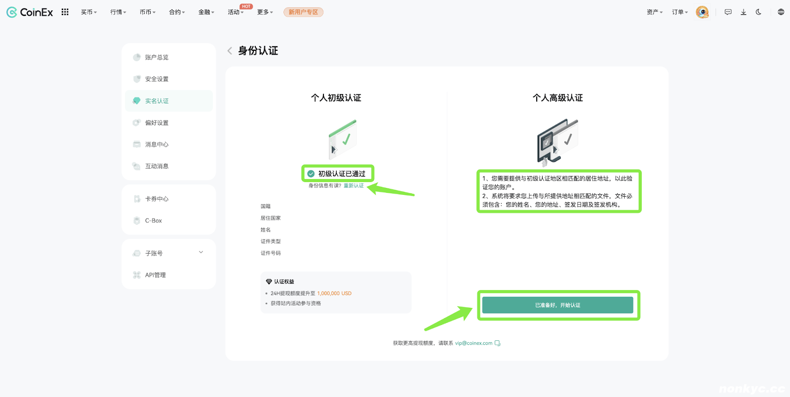 CoinEx官网个人高级认证完成指南(Web)