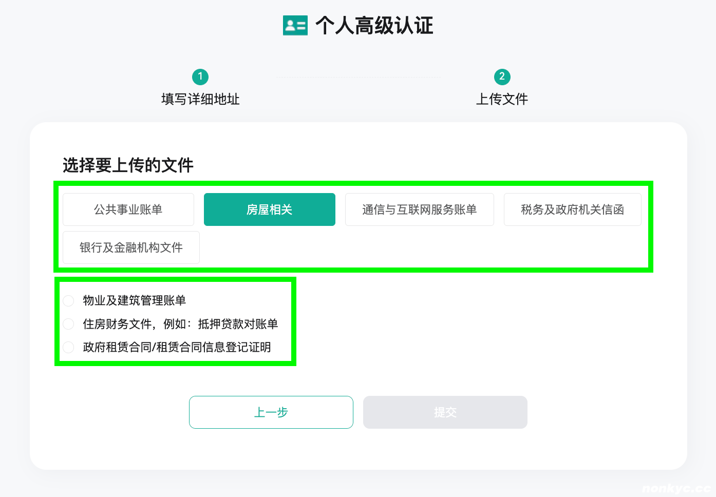 支持公共事业账单、房屋相关、通信与互联网服务账单、税务及政府机关信函、银行及金融机构文件等,选择要上传的文件类型后可以查看具体支持哪些文件。