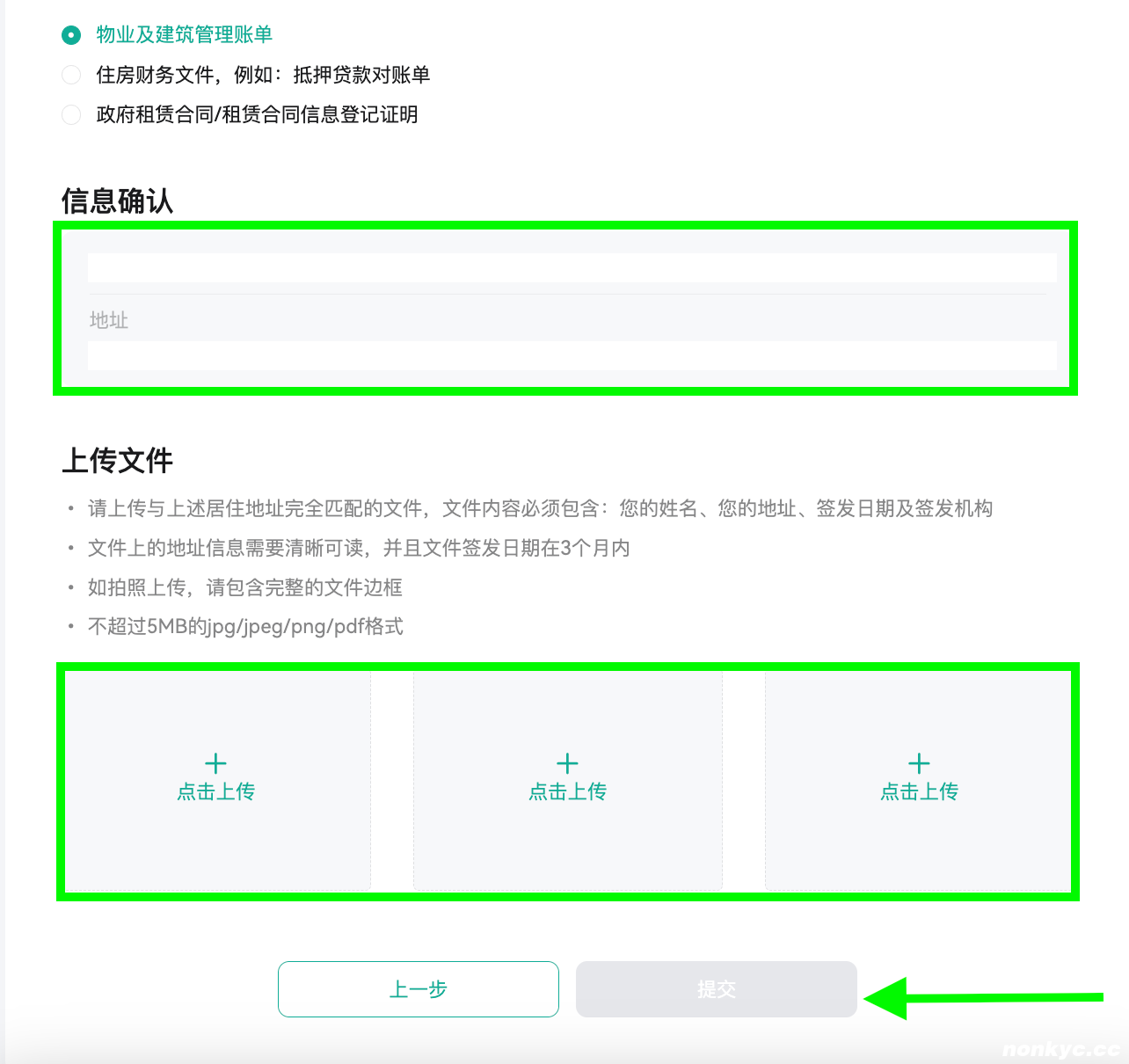 注:填写的居住地址需要与即将上传的地址证明文件内的地址完全一致。