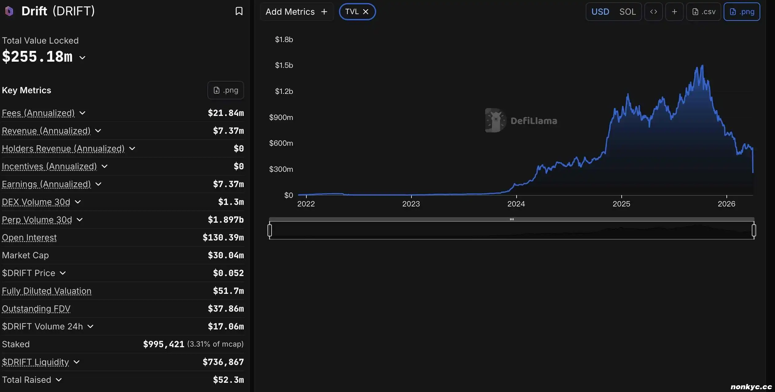 它由 Cindy Leow 和 David Lu 于 2021 年联合创立,是 Solana 生态中规模最大的去中心化永续合约交易所。2024 年初,Polychain Capital 领投了 2350 万美元的 A 轮融资,总融资额达到 5230 万美元。截至事发前,Drift 累计交易量超过 550 亿美元,总锁仓量突破 10 亿美元,活跃交易者超过 20 万人。