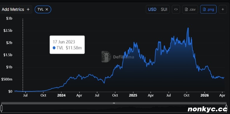 根据DeFiLIama的数据,由于 Sui DeFi 的稳定币市值高达约 517 美元,其总锁定价值约为 5.8739 亿美元。
