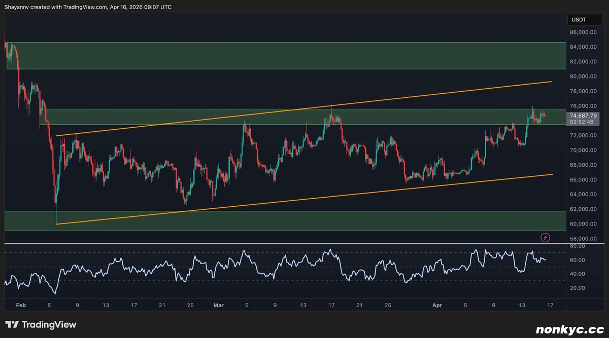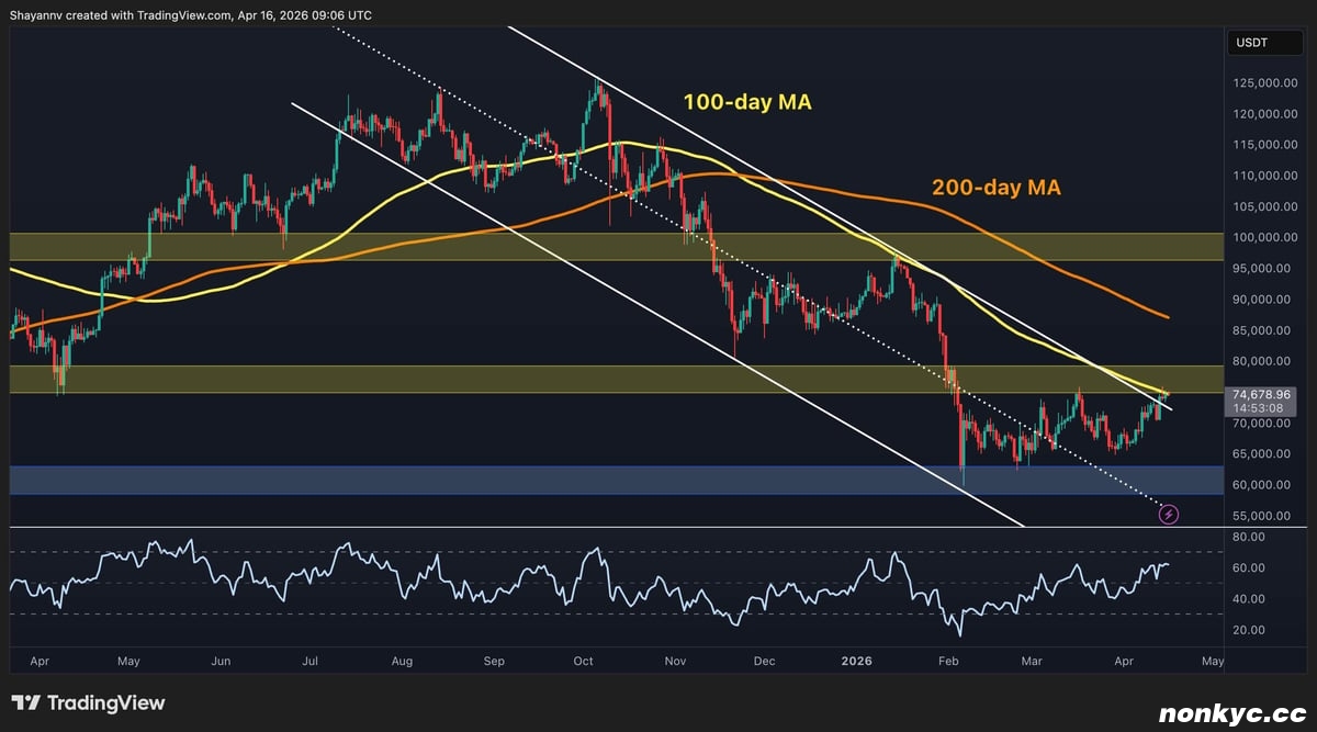 在本轮调整周期中,比特币似乎首次尝试真正突破下降通道,目前价格已突破7.4万至7.5万美元附近的上轨,并紧邻附近的100日均线。相对强弱指数(RSI)也攀升至60以上,这是自2月份暴跌以来最强劲的日线动能指标,为此次突破尝试增添了一定的可信度,同时并未显示超买信号。