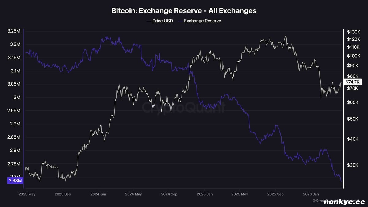 比特币交易所的储备已降至约 268 万美元($BTC)。这是自 2023 年年中以来的最低水平,与 2024 年初 320 万美元($BTC)的峰值相比,出现了大幅下滑。此次下跌幅度巨大且持续,在 2025 年下半年加速,即使价格从 12.5 万美元的峰值大幅回调,下跌趋势依然没有停止。