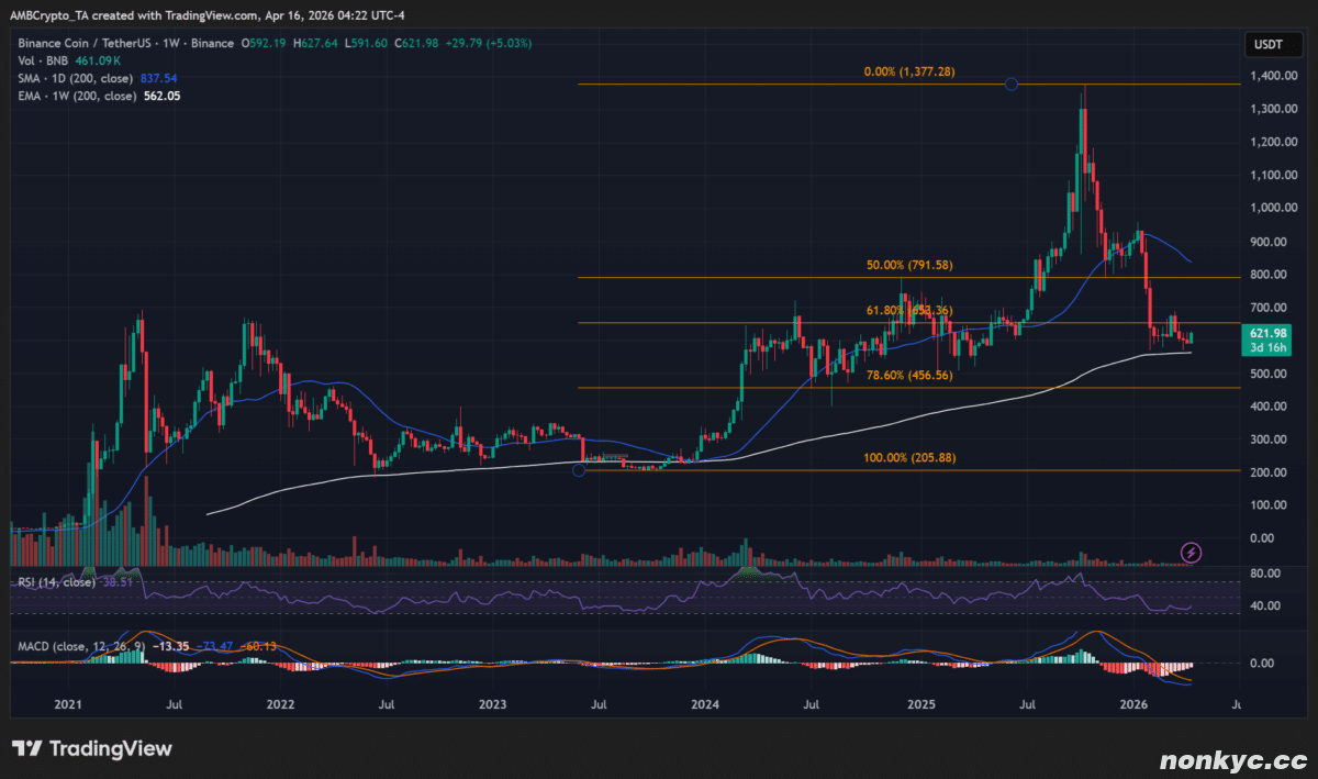 从价格图表来看,BNB本周上涨了 5%,截至发稿时交易价格为 622 美元。然而,它仍比去年 10 月创下的 1370 美元的历史高点下跌了约 80%。