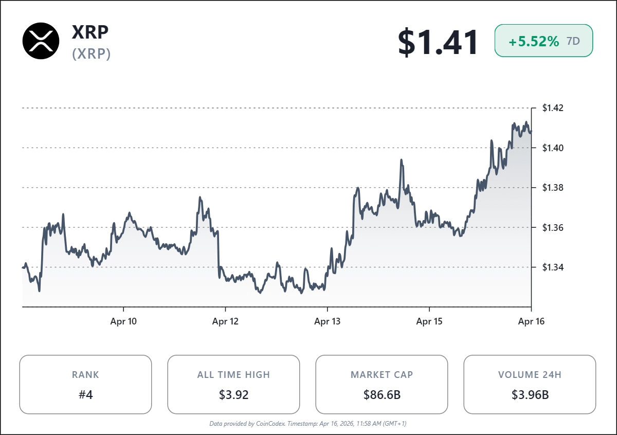 截至发稿时,CoinCodex 数据显示$XRP 的交易价格为 1.41 美元,处于一个关键区域,短期波动与长期积累趋势在此碰撞。
