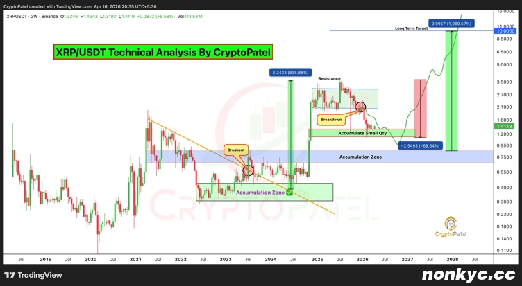 目前的形态表明,XRP正在重返一个长期结构水平,该水平在过去的周期中曾起到跳板作用。如果这种势头能够保持,Crypto Patel 认为,从长远来看,XRP 的价格可能会上涨至 10 美元区间。