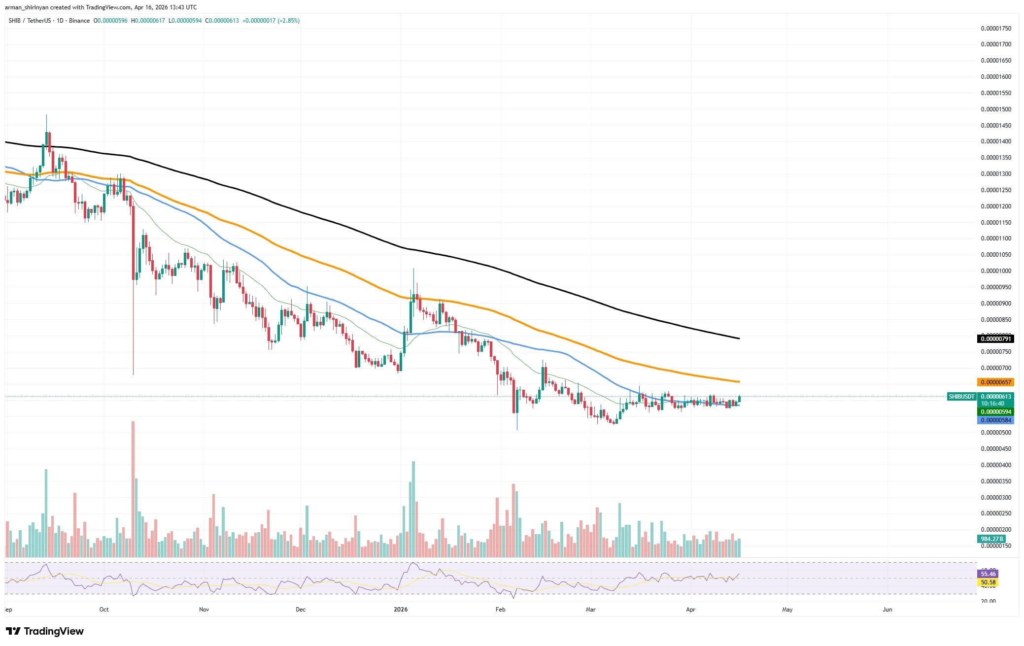 $SHIB已进入 $0.0000060 水平附近异常狭窄的盘整区间,在经历了数月的持续下跌和波动性飙升之后,价格走势趋于平缓,波动性也显著收窄。