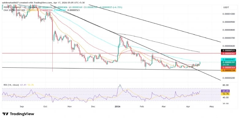 在过去的两个星期里,Pepe 的价格经历了缓慢但稳定的复苏,从 0.00000317 美元回升至目前的交易价格 0.000004 美元,涨幅达 25.5%。