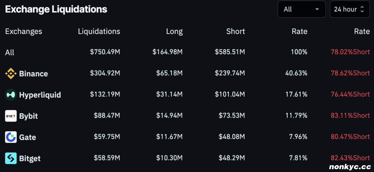 CoinGlass数据显示,过去24小时内有超过164,835名交易者被强制平仓,总损失高达7.4781亿美元。其中,单笔损失最大的一笔来自Hyperliquid平台上的BTC /USD交易,金额高达1575万美元。