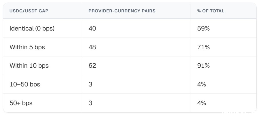 在提供商层面出现了更大的差异,同一交易走廊内的价格差距可能超过数百个基点,使得执行质量取决于流动性的获取和跨场所的路由。