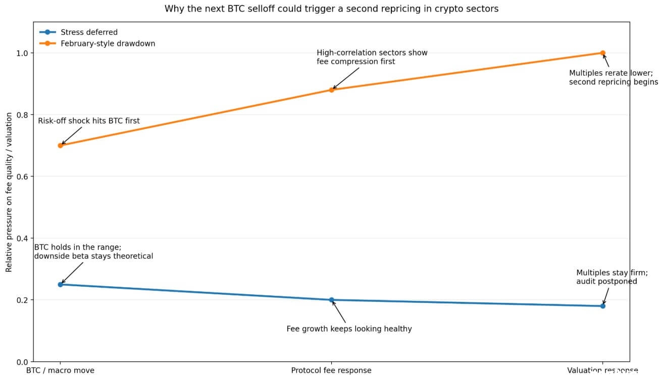 如果这种方向性关系在下跌时仍然成立,即费用首先下降,倍数在最初的价格变动后的几周内压缩,那么$BTC 的下跌暴露了高相关性行业的费用脆弱性,可能会引发二次估值调整。