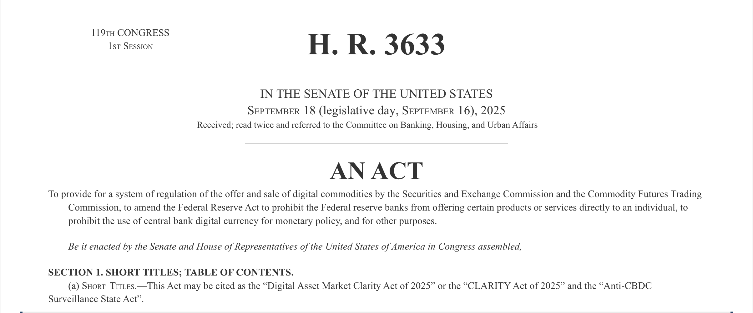 2025 年数字资产市场透明度法案(又称 CLARITY 法案)是一项全面的加密货币市场监管框架,它建立了资产分类、监管管辖权和对加密货币市场的监督。