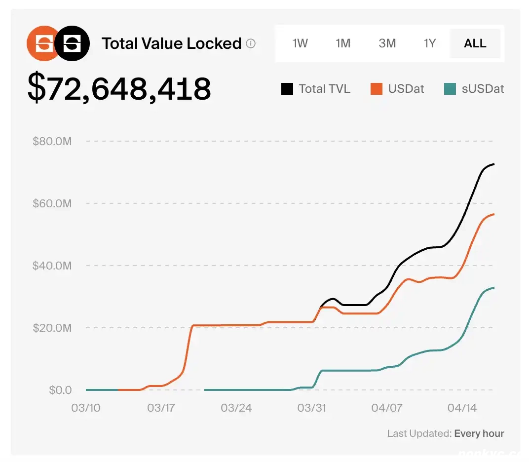 Saturn Credit 的 sUSDat 是承接 STRC 收益的质押类生息稳定币,该协议 TVL 一个月多内从零冲到 7260 万美元。