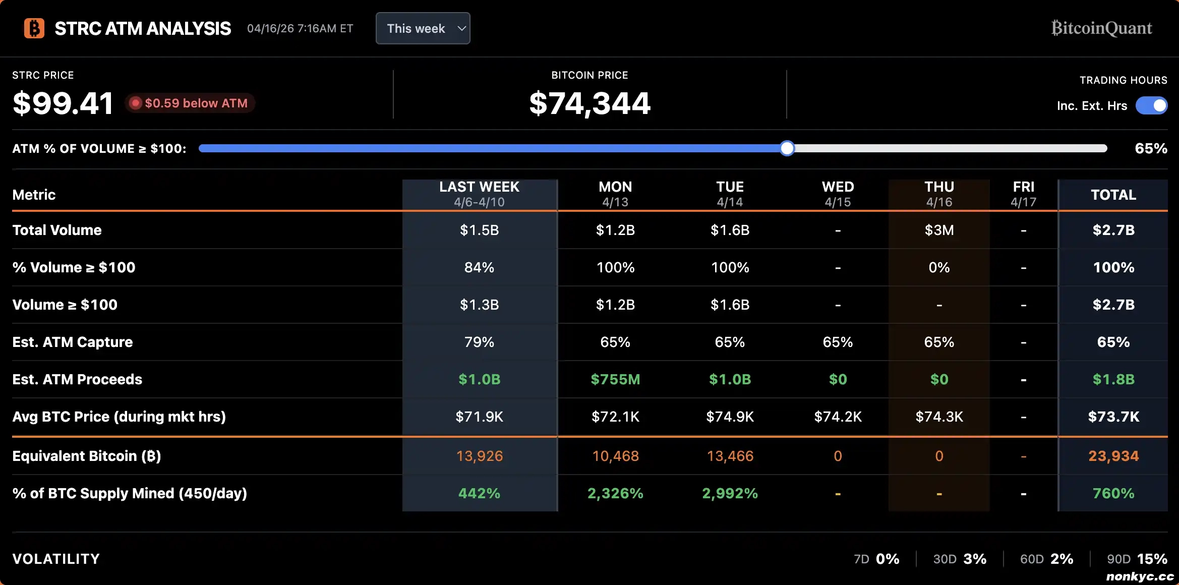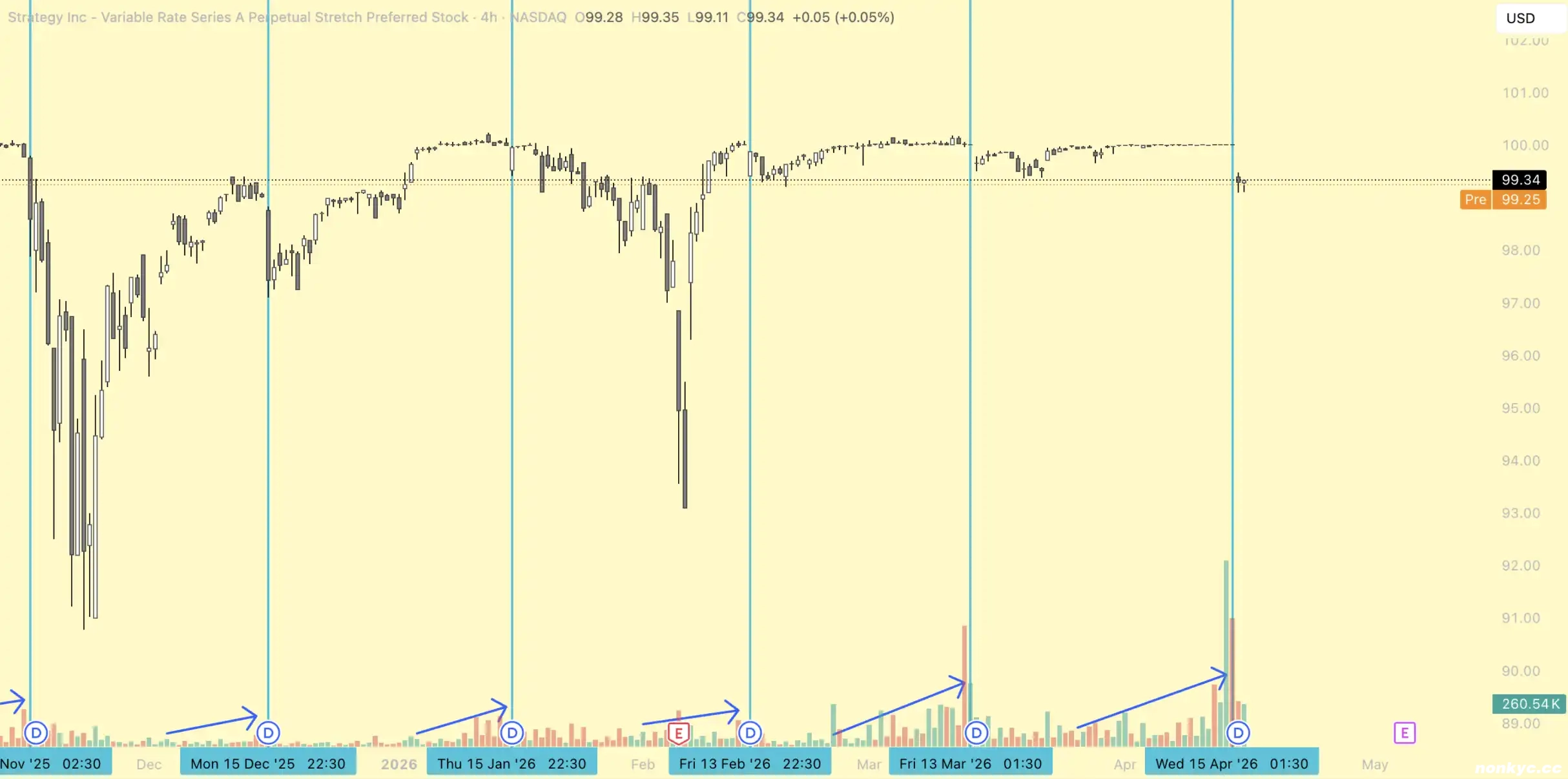 如图所示,成交量在除息日前一周开始爬升,除息日当天或前一天冲到顶点,除息日之后迅速归于沉寂。4 月这一轮的放量比 3 月明显陡峭得多,说明越来越多的资金开始参与了 STRC 的除息套利。