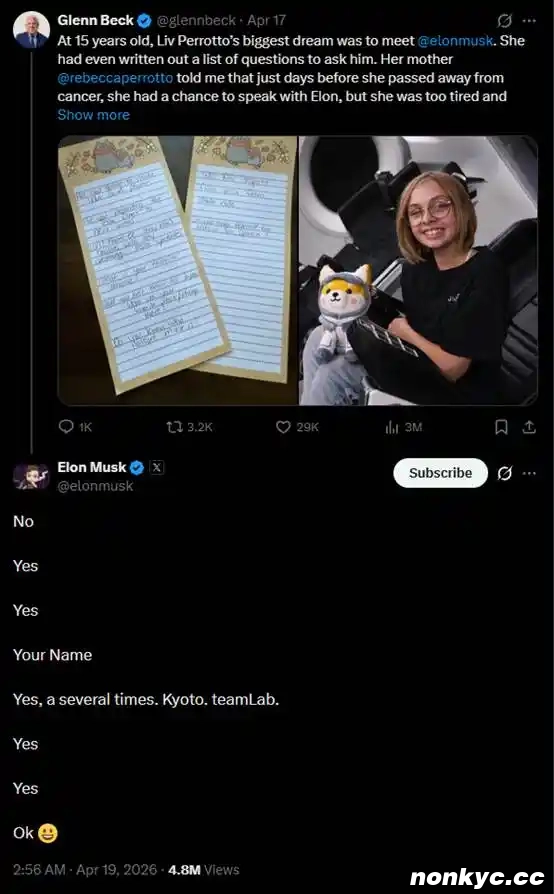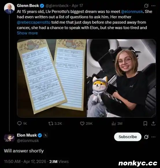 4 月 17 日,马斯克在 @glennbeck 提及此事的推文下回复,「稍后回答。」