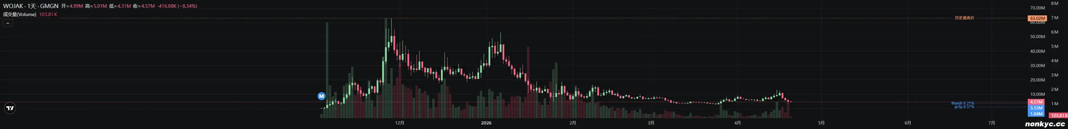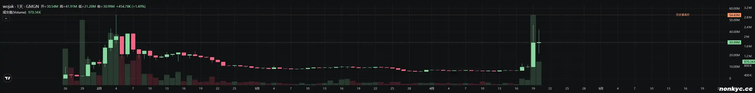 Wojak 是一个经典的 meme 形象,meme 玩家们都不陌生。SOL 上的 $WOJAK 在 3 月底开始缓慢复苏,从 300 万美元市值逐渐回暖到最高 1200 万美元市值。