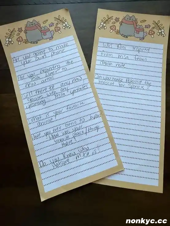Liv 生前最大的梦想,是见到马斯克,她甚至列出了一份问题清单,准备在见到马斯克的时候得到答案。在 Liv 去世后,她的母亲 Rebecca Perrotto 公布了她生前手写的这份问题清单: