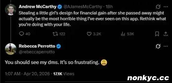 在 Aster 上架 ETH $ASTEROID 的推文下,@AJamesMcCarthy 表示,用一个去世小女孩的创意设计牟利是恶劣的行为。Rebecca Perrotto 回复,「这真是太令人沮丧了」