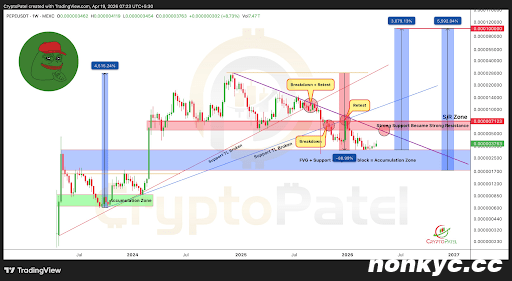 2023年,$PEPE在经历了一段漫长的下跌和回测后,几乎进入了与此类似的FVG+订单区块汇合状态,随后价格飙升了4515%。Crypto Patel的预测认为,当前的结构与当时的设置如出一辙,同样经历了下跌、回测和需求复苏,并预测本轮周期将实现5592%的扩张目标。