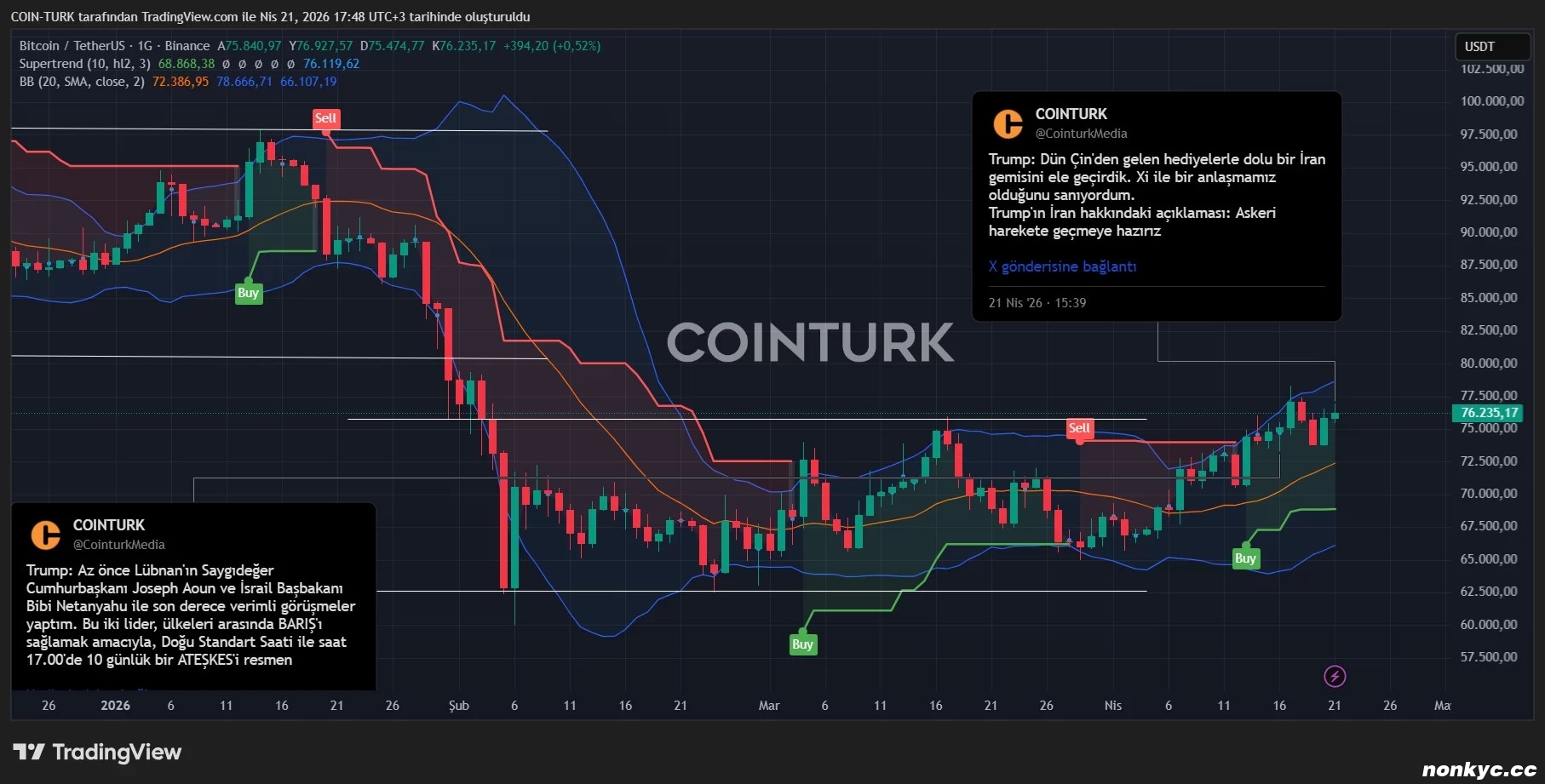 与此同时,比特币价格继续守住76,000美元上方。在地缘政治方面,据Al-Hadath报道,万斯和伊朗议会议长穆罕默德·巴格尔·加利巴夫已抵达伊斯兰堡。这预示着双方可能举行和平谈判,考虑到伊朗此前一直否认此类计划,这无疑是一个积极的进展。