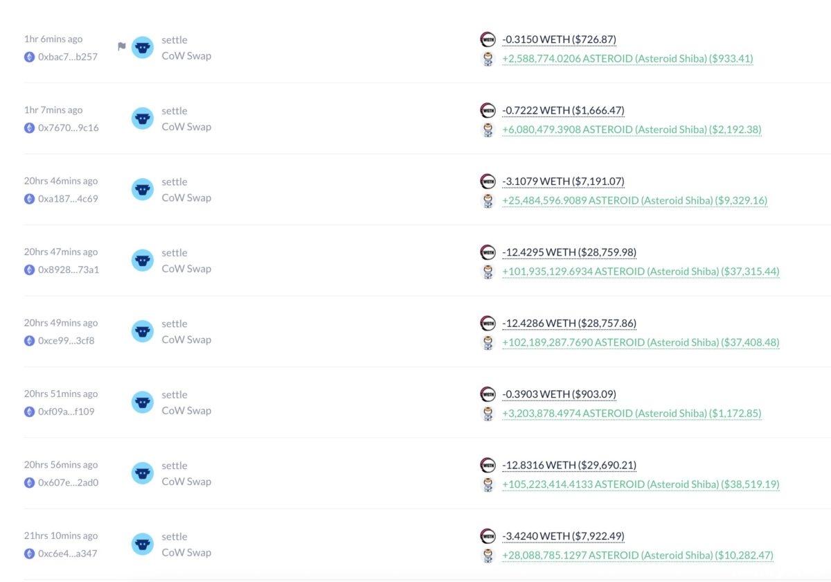 当巨鲸资金将超过 100 万美元从以太坊 (ETH)转入 Asteroid Shiba 时,价格开始剧烈波动,这预示着流动性驱动的走势。这种转变源于资金寻求更高的上涨空间,从市值较大的稳定市场转向流动性较差、风险较高的市场。