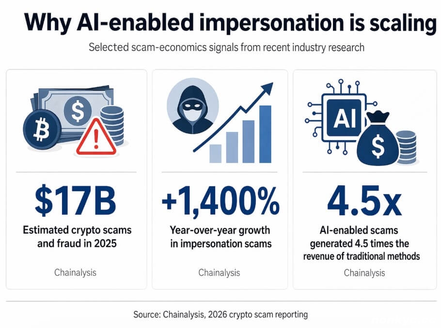 Chainalysis 估计,到 2025 年,加密货币诈骗和欺诈造成的损失将达到 170 亿美元,其中冒充诈骗同比增长 1400%,而人工智能诈骗产生的收入是传统方法的 4.5 倍。