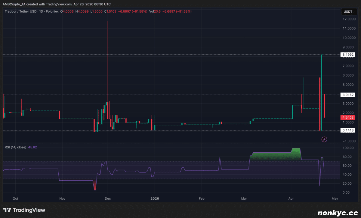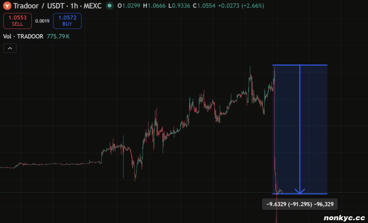 调查人员还强调,自 2026 年 3 月以来,该山寨币价格已上涨 900%。然而,4 月 24 日,TRADOOR 在短短 30 分钟内下跌了 90%。