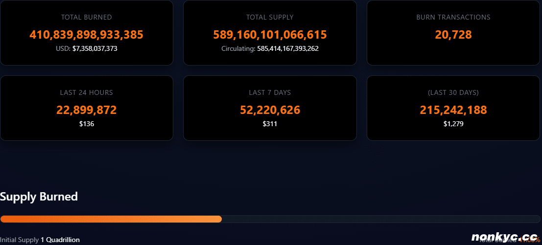 此外,销毁的$SHIB代币总量占初始供应量1千万亿枚的41.08%。目前$SHIB的总流通供应量为585.4万亿枚。