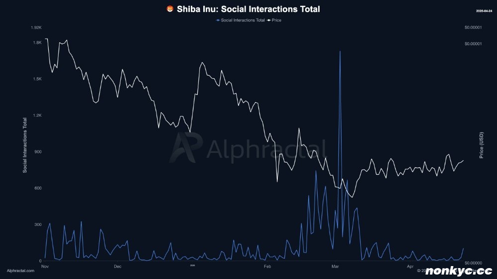 根据 Alphractal 的数据,$SHIB的活跃社交媒体帖子数量飙升至 4000 条,创六个月新高,而总互动量也达到了 1800 次。这些数据表明,整个行业都在复苏,而不仅仅是某个单一代币。