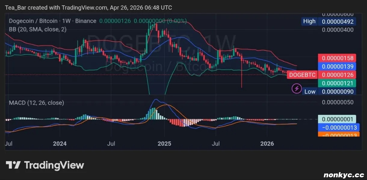 MACD 指标几乎纹丝不动,徘徊在 0.00000001 附近。这说明了真正的问题:狗狗币的价格不仅以美元计价下跌,而且其表现也远逊于比特币。