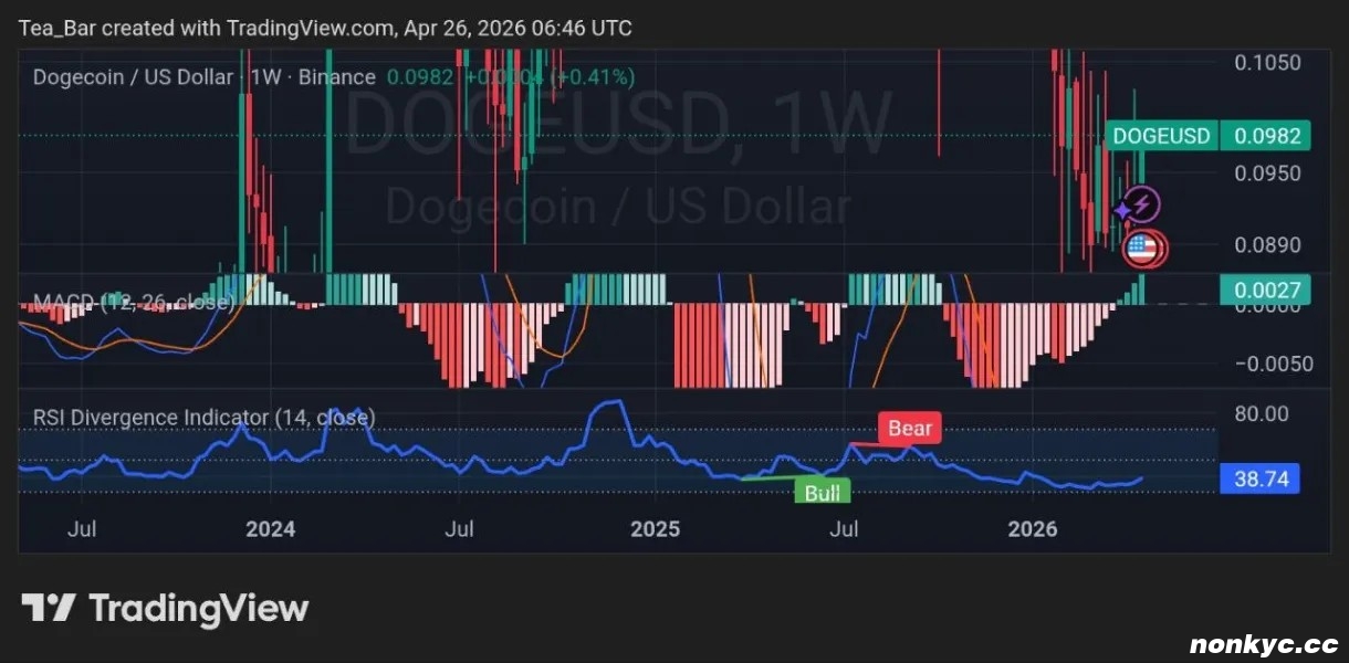 在$DOGE /USD 周线图上,价格在触及 0.089 美元附近的低点后已回升至 0.0982 美元,各项指标也正在发生变化。