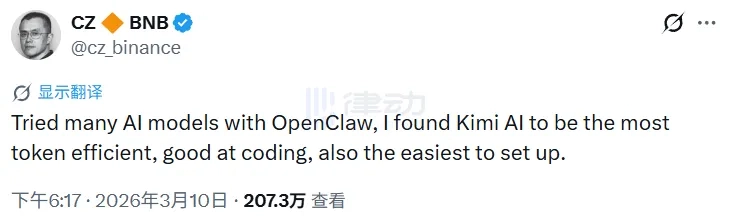 值得注意的是,CZ 也曾于 3 月 10 日公开称赞「Kimi 是最高效、擅长编程」的 AI 模型。
