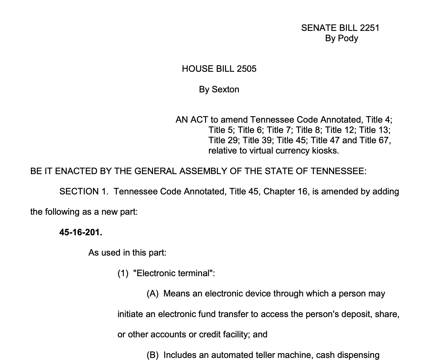 4月13日,李签署了田纳西州众议院第2505号法案,该法案规定从7月1日起,安装加密货币自助服务终端将被视为A级轻罪。根据州法律,这些机器被重新归类为非法物品,这可能会使运营商和托管这些机器的企业面临最高11个月零29天的监禁和2500美元的罚款。