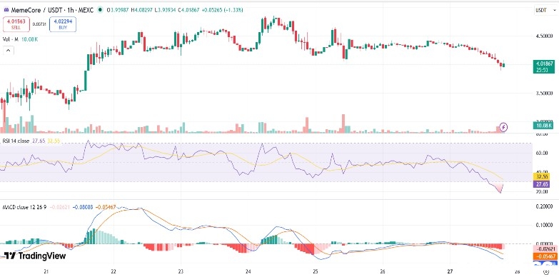 截至发稿时,根据 CoinMarketCap 的数据,MemeCore M(-11.57%)的交易价格约为 4.02 美元,过去 24 小时内下跌了约 8%。该加密货币目前的市值约为 52 亿美元,日交易量为 1938 万美元,较上年同期增长了约 47%。