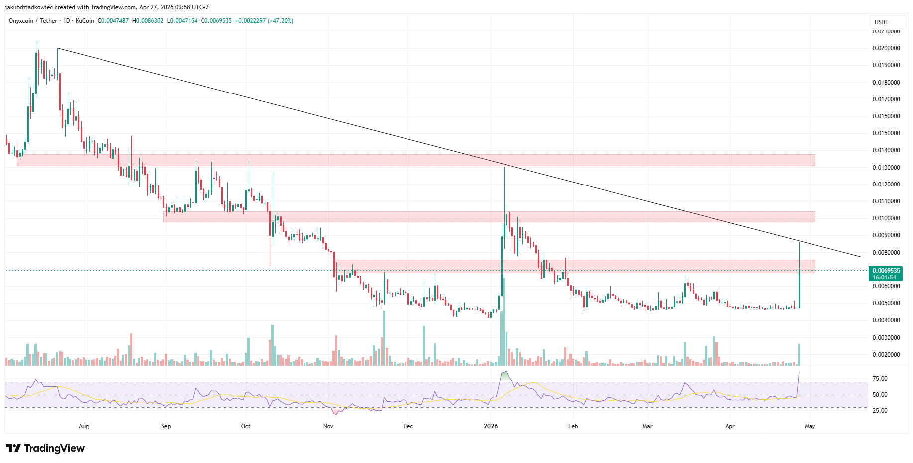 4月27日,Onyxcoin (XCN) 领涨该板块,日涨幅高达47.20%。盘中价格一度触及0.0086美元,创下1月中旬以来的最高水平。随后,XCN价格回落至0.0069美元,重新测试了0.0068美元至0.0075美元之间的阻力区间。