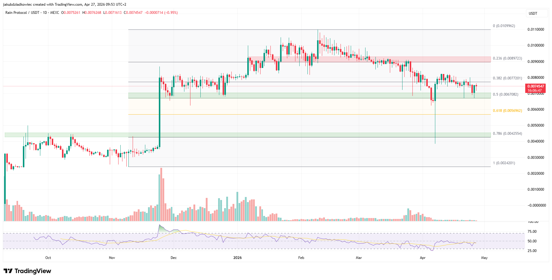 目前的走势只有两种可能。成交量持续低迷,RAIN 的价格在斐波那契水平附近徘徊。突破方向很可能来自更广泛的山寨币轮动,而非特定代币的需求。