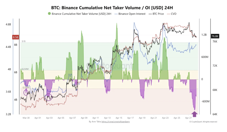 衍生品数据显示币安的卖方交易活动强劲。加密货币分析师Amr Taha指出,4月27日24小时累计净交易量下降了8.28亿美元,为3月下旬以来的最低水平。