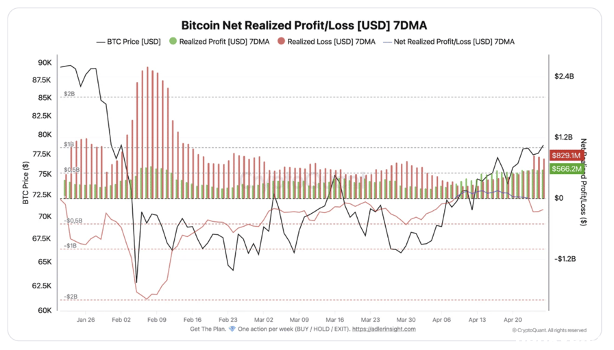 链上数据也印证了这一观点。加密货币分析师Darkfost指出,七日平均每周已实现亏损达8.29亿美元,而已实现盈利为5.66亿美元。净已实现盈利在4月9日短暂转正,但两周内再次逆转。