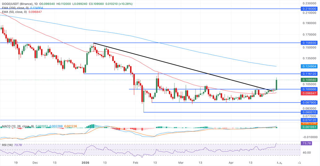截至周三发稿时,狗狗币交易价格高于 0.1000 美元,突破了 50 日指数移动平均线 (EMA) 0.0968 美元和此前在 0.0967 美元附近构成下行阻力的趋势线。这使得狗狗币的短期走势转为温和看涨,但仍受 200 日 EMA 0.1249 美元下方的阻力限制。